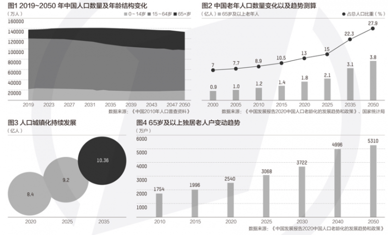 按照联合国标准,60岁以上人口占总人口数10%以上或65岁以上人口占总数的7%,即为进入老龄社会。中国在1999年60岁以上人口数达到1.67亿,占总人口12.5%,正式进入老龄化社会。这一数字在10年后的2019年净增了近1亿,达到了2.54亿,占到总人口18.1%。由于生育率和生育二胎意愿的持续低迷,国家统计局此前预测,2030年的老龄化人口将达到3.7亿,占总人口25.5%;而中国老龄化全国委员会则预测,2050年中国的老龄人口将上升至4.87亿,占总人口的35%。