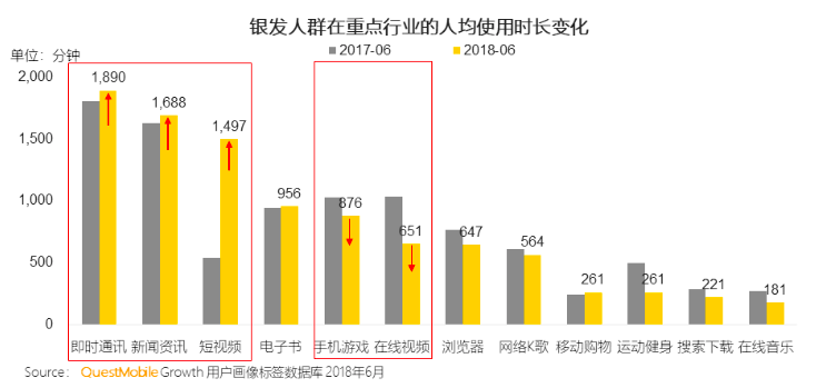 根据Quest Mobile发布的《中国移动互联网“银发经济”洞察报告》显示,中国银发网民的数量超过5000万人,在各个时间段(包括午夜和凌晨)对手机的依赖度都比中青年群体高。短视频在老年人中的扩张速度明显,从2017年6月到2018年6月,银发人群的短视频使用时长从500分钟,增长至近1500分钟。