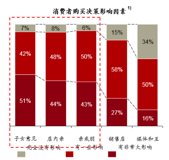最后是在决定环节上。一方面是子女意见,数据显示,老年人消费取向的51%最终是子女帮助决定的,在消费环节由于年轻人的收入水平和购物经验比老年人要高很多,所以多数老年消费者倾向于相信中年或青年阶段的家庭成员,而自己的意见在消费中起到较小的作用。