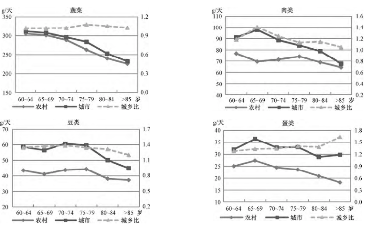 通过中国农业科学信息研究院的相关文献显示,城乡老人消费差异在谷物和基本性生活副食(蔬菜、肉类、豆类等)消费上逐渐减小,在营养性副食消费(奶类、水果和水产品)上有所增加,尤其在高龄阶段。