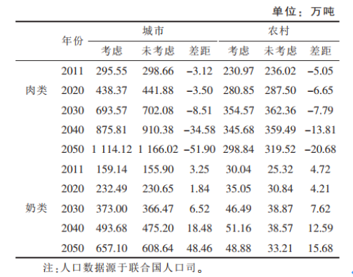 下表为文献中推测出的未来肉类和奶类的城乡老年人消费对比,可以明显看到肉类的消费欲望都在逐渐减小,但农村的减小速度小于城市。奶类营养品的消费欲望都在上升,农村的上升趋势依然小于城市。