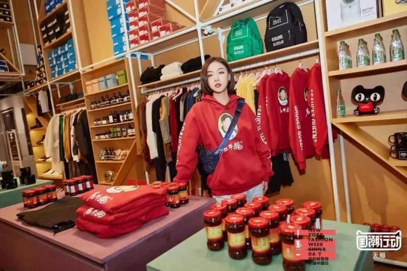 老干妈最让人惊艳的一次,还是2018年10月随着天猫国潮行动,以“国民女神”的身份亮相纽约时装周。联名款卫衣,更是让老干妈有了“潮味”。
