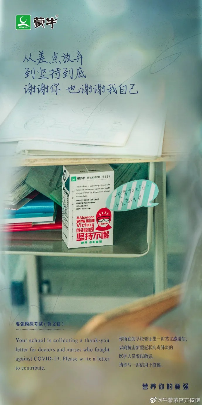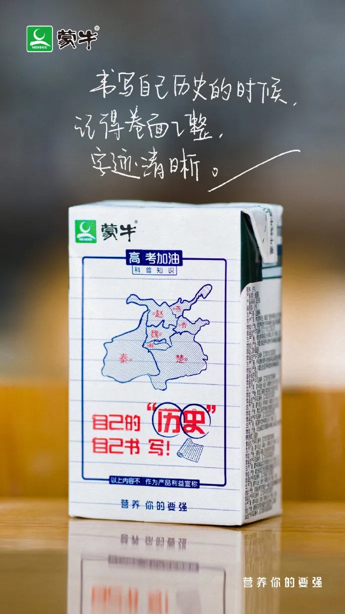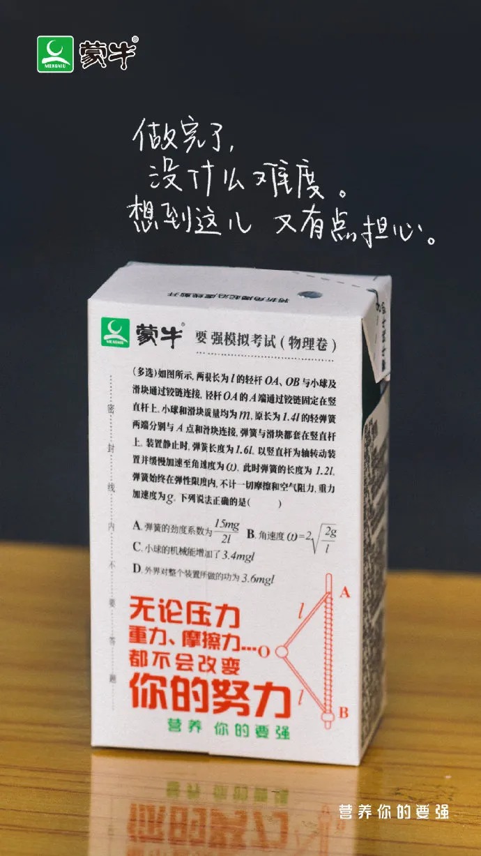 这个视频以外,蒙牛还推出了一系列很搞笑的高考包装文案,十分适合提着去送给家有高考孩子的家庭,今年亲朋好友的走访佳礼当之无愧。