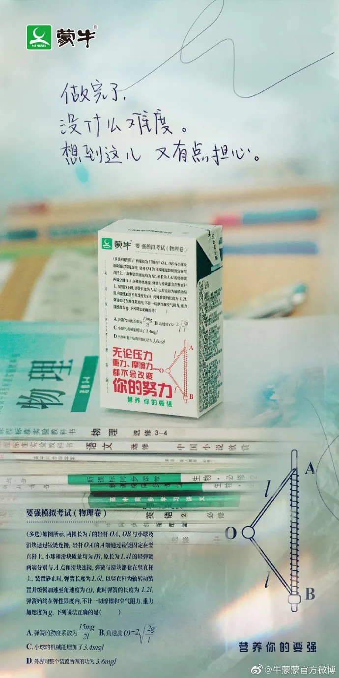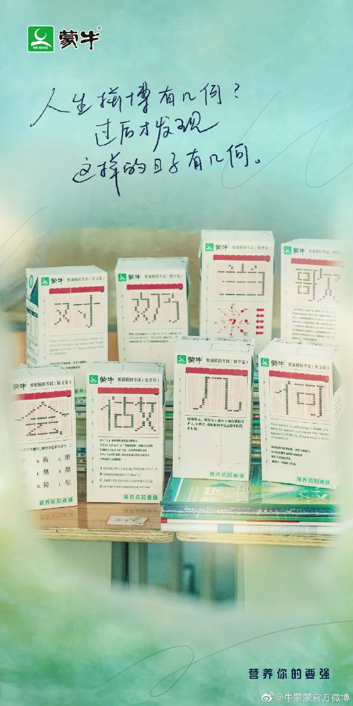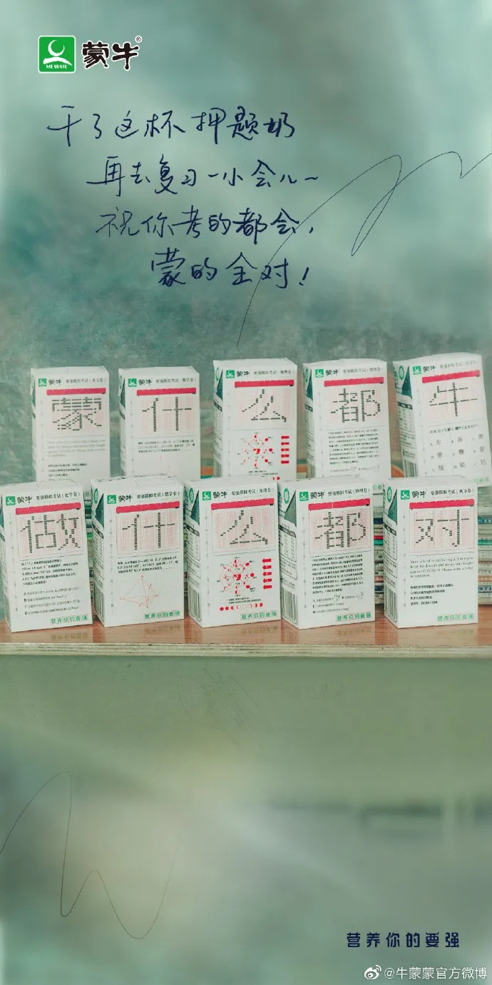 所以【蒙什么都牛,做什么都对】切中了家长和学生的心理,把品牌名字化用在里面,又是人们日常鼓励考生的常用语,传播性就已经达到了。
