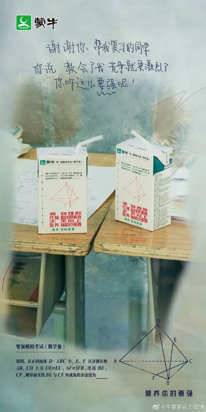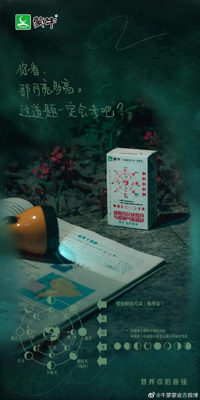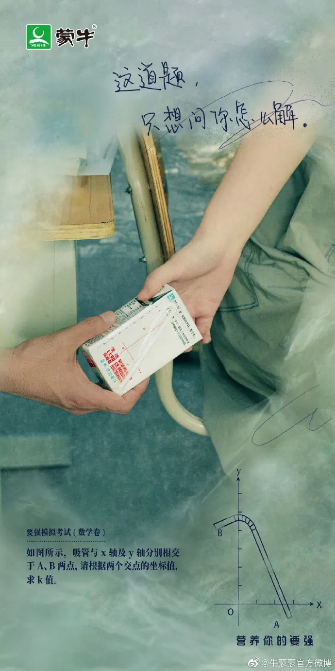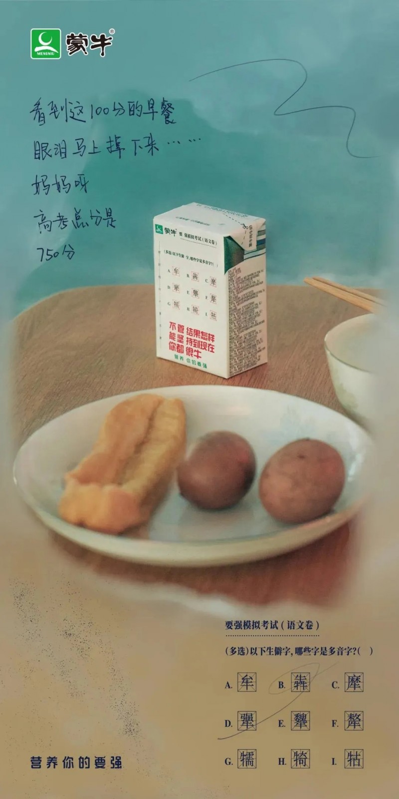 所以【蒙什么都牛,做什么都对】切中了家长和学生的心理,把品牌名字化用在里面,又是人们日常鼓励考生的常用语,传播性就已经达到了。