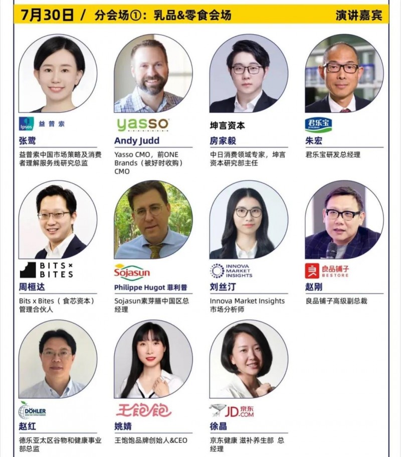 所有这些问题,都将在7月30日的FBIC2020全球食品饮料创新大会【乳品&零食专场】上获得答案。在这里,Foodaily邀请到来自益普索、Innova、君乐宝、美国冰淇淋品牌Yasso、欧洲植物基领军者Sojasun素芽膳、良品铺子、王饱饱、德乐、京东健康、坤言资本、Bits x Bites等品牌与公司的产品决策人及资深专家,一同探讨乳制品和零食行业接下来3-5年的发展方向,为行业建言献策,推动中国食品创新力!
