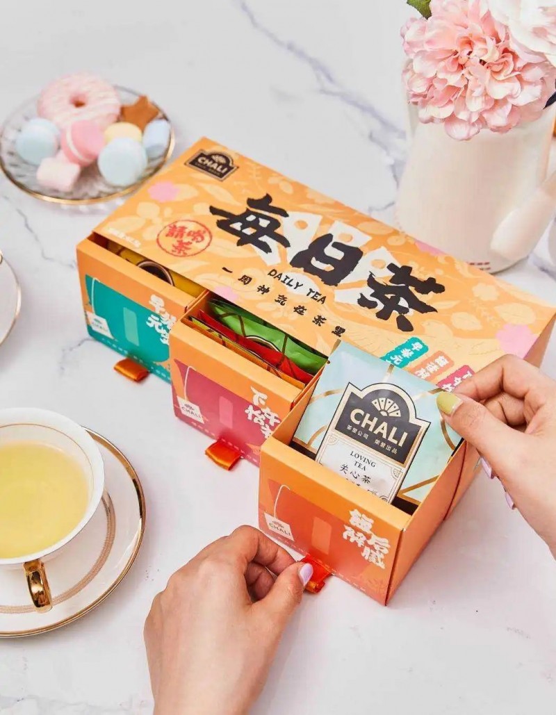 面向年轻群体,CHALI推出三个产品板块。第一类是以桂花乌龙等产品为代表的花草茶。第二类是以蜜桃乌龙为代表的水果茶,今年2月,蜜桃乌龙在李佳琦直播间一晚卖出8万盒。第三个是以组合茶为代表的场景系列,比如每日茶产品共21包,按照早餐元气、下午怡神、饭后解腻三个功能,一个星期每天三包进行搭配,为消费者解决每日在不同场景的需求。