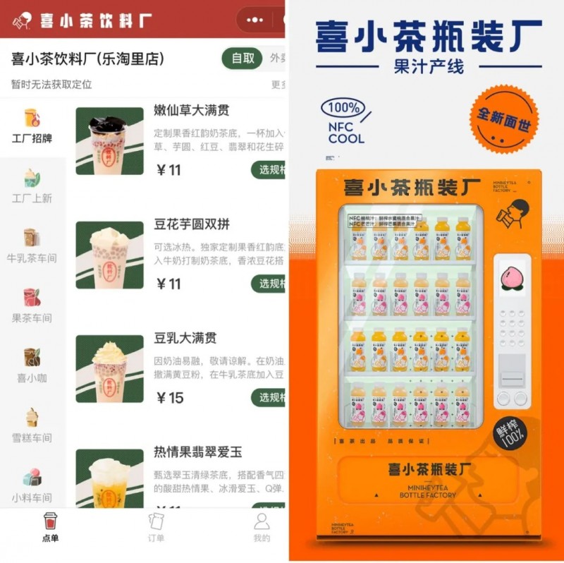 喜小茶第一家店开在了深圳华强北,装修和店面设计伴着浓浓的工业复古风,饮品原料一改喜茶往日风格,采用是比较传统的烧仙草、芋圆、红豆等,价格大致在8-16元区间。喜小茶的第二家厂牌「喜小茶瓶装厂」也已出炉,已推出两款口味的瓶装鲜榨果汁(桃桃味和芒芒味),一瓶售价19元,尝新价买一送一,通过喜茶GO小程序可购买。