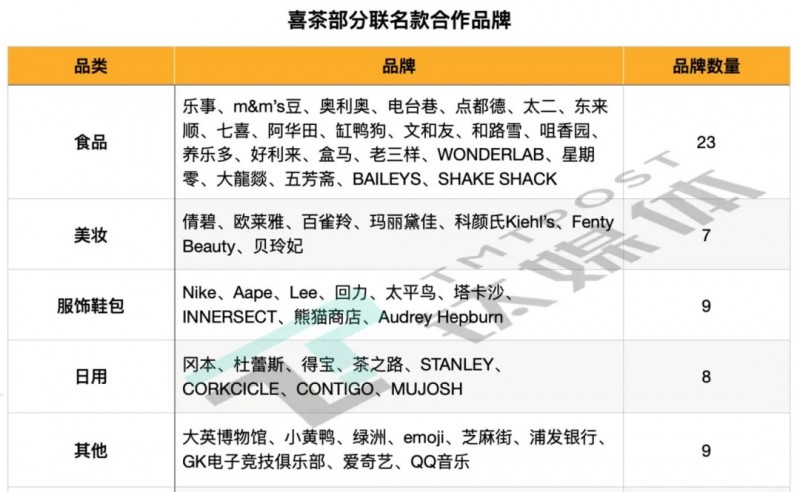 钛媒体整理了一份喜茶目前为止联名合作过的消费品牌(不完全版)。