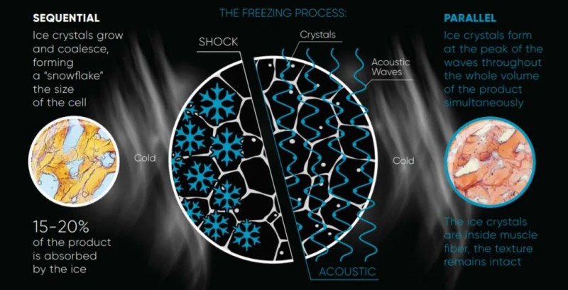 而AEF(Acoustic ExtraFreezing)技术可以说是冷冻食品加工和冷链物流的革命性创新,其主要应用于食品的长期储存。该技术通过设备产生声波使得冷冻产品内部形成纳米级冰晶,从而使得食物细胞的结构以及食物的味道、质地、颜色和生化特性得以保留。