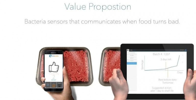 Innoscentia是一种细菌传感器,当食物腐败时,传感器会发出数字化信号。通过手机或大型电子设备连接传感器,就能监测食品的新鲜度。这一传感器可延长产品的货架期,保证食品供应链的可追溯性和食品安全,无论是对生产者,零售商或是消费者都有很大的帮助。