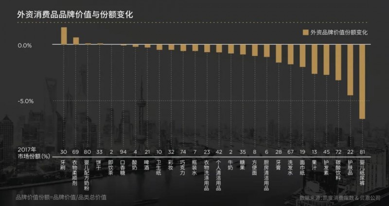 从结果上来看,国货品牌在一直向好,正发生显著的替代效应。2017 年国务院正式将每年的 5 月 10 日设立为“中国品牌日” ,同年中国快消品市场规模达到6390 亿,其中国货品牌比例为 75%[2]。其中 26 个快消品品类中,雀巢、宝洁和联合利华等跨国公司所拥有的品牌有 18 个品类的市场份额在下降,只有 4 个品类在上升[3]。