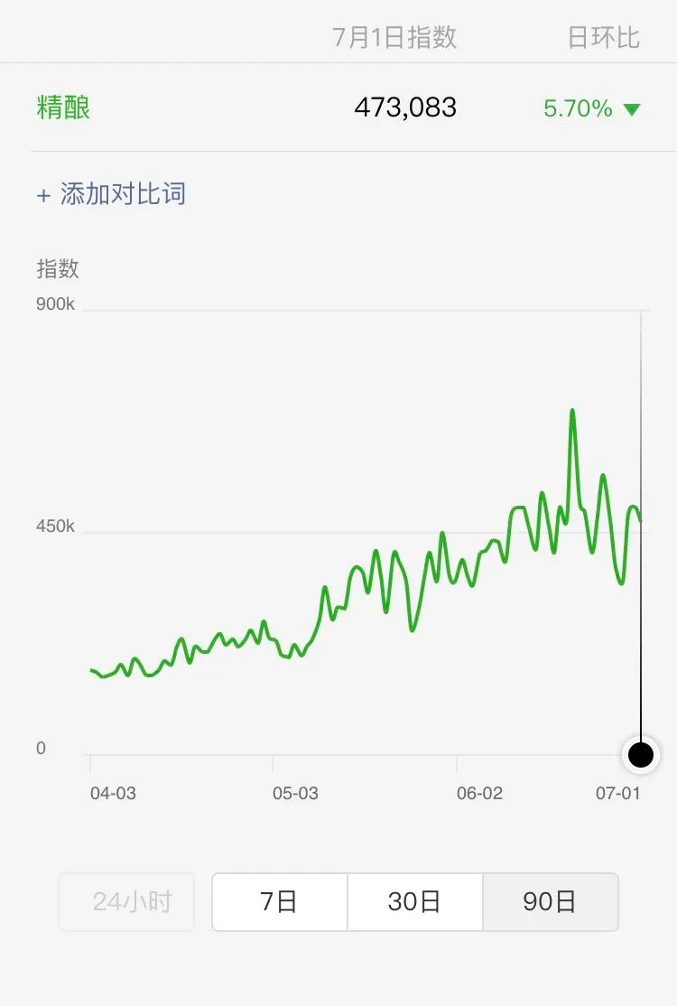 就今年疫情影响,从高大师的销售数据来看,4月份环比逐渐开始恢复。从微信指数同样能看到这一趋势,从5月初开始“精酿”这个关键词整体走高,啤酒与精酿出现在手机上与出现在餐桌上的数据正相关,喝到首先要能看到。