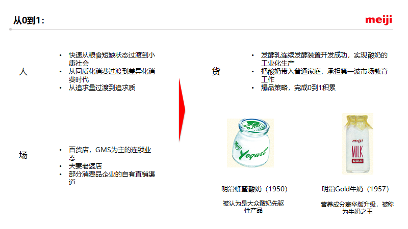 明治创立于二战前不久,这段时间是日本处于粮食极度短缺的状态。牛奶,奶粉、酸奶是当时日本上流阶层的消费品,中国七八九十年代也没有人喝得起酸奶和奶粉。在二战之后,日本在美国扶持之下用不到20年的时间快速地从工业化成熟阶段步入大众化消费阶段。