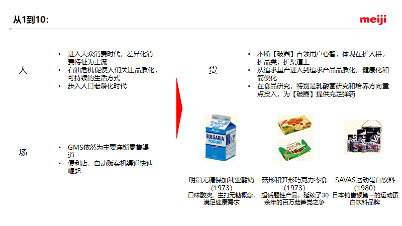 刚才所讲的就是明治1到10。总结一下,如果明治的0到1靠的是自己的产品力,这一单点来突破,那在1到10的阶段,靠的就是全品牌产业链的驱动,在过程中不断地弥补自身能力短板。