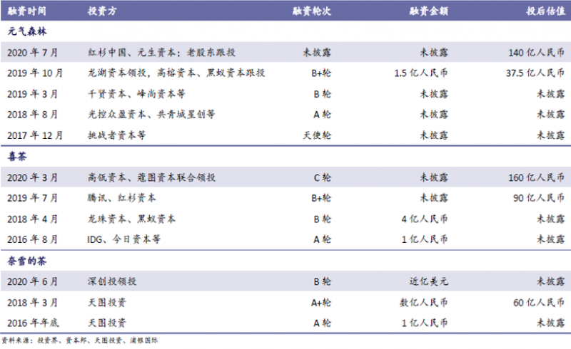 新兴饮料公司喜茶、奈雪、元气森林均于近期完成新一轮融资。据各大媒体广泛报道,元气森林7月完成最新一轮融资后,投后估值达140亿人民币。媒体披露的元气捷报显示,元气森林2020年1-5月公司收入达6.6亿人民币,若按年化计,公司2020年收入将达15.8亿人民币,投后估值约对应9倍2020年市销率。喜茶则于3月完成C轮融资,经各大媒体广泛报道的投后估值为160亿人民币。喜茶目前有超过450家门店,假设单店月均收入100万人民币,则年收入约54亿人民币,投后估值对应3倍预期市销率。根据彭博普遍预期,国内外已上市的饮料头部企业,其2020年市销率大概在1倍到9倍之间。
