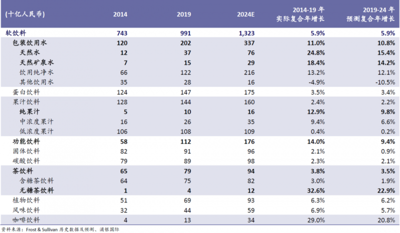 我们看好的料细分品类包括:1、天然水和矿泉水(健康意识和收入提升;居家消费比例亦上升;目前市占率第一名是农夫山泉);2、低糖低卡、清淡口味气泡水(受益于健康意识和更高口感要求);3、无糖茶(趋势所在,虽然目前市场规模不大);4、纯果汁(果汁市场集中化程度较低,胜负未分);5、咖啡(渐渐从以往的格调型消费向日常消费转变)。