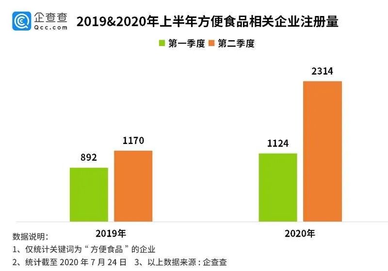 据企查查数据显示,2020年一季度方便食品相关企业注册量达千余家,较2019年同期上升26%,疫情后的二季度,相关企业注册量更是同比上升了98%;截至2020年7月24日,今年方便食品相关企业注册量已达3766家,接近2019年全年水平。