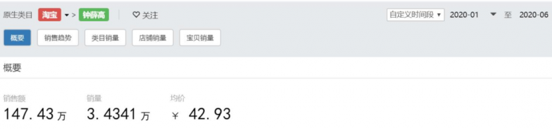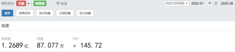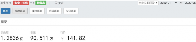 根据魔镜市场情报后台数据, 钟薛高在淘宝+天猫平台2020年1月至6月销售额合计1.28亿元,销量90.5万单,均价141.82元。其中,天猫店销售额1.27亿元,销量87万单,均价145.72元;淘宝店销售额147.43万元,销量3.43万件,均价42.93元。天猫店销售额占总销售额的99.2%,其销售额、销量、均价均高于淘宝店,其中均价是淘宝店的3倍多,可见产品策略不同。