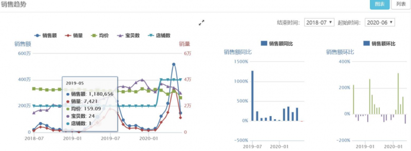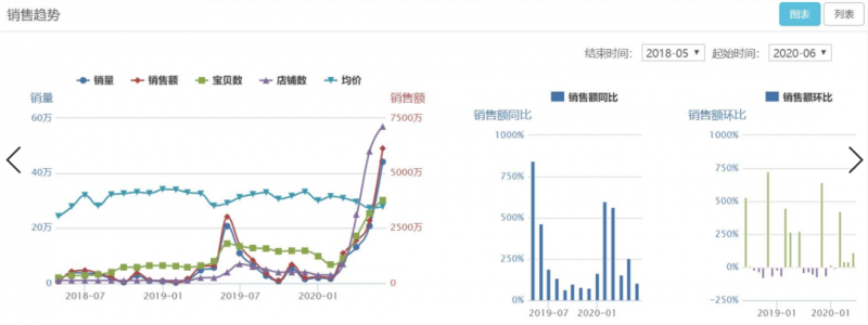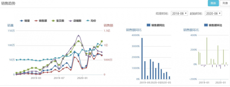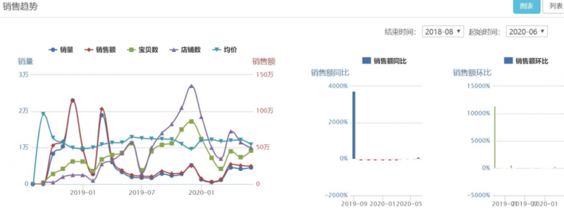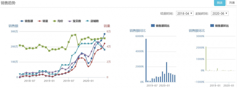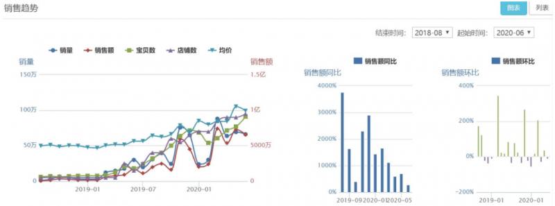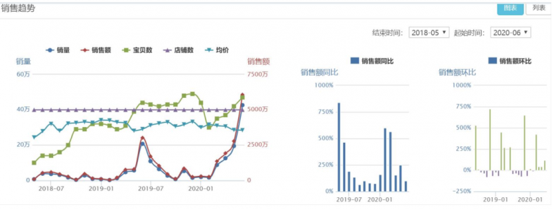 销售额每月同比都有不同程度的增长。期间销售额及销量变化趋势一致,2019年6月前相对平缓,在2019年6月销售突破千万直接达到3000万元,之后呈下滑趋势,销售额回到百万元状态,直至2020年3月又突破千万,且3月至6月期间迅猛攀升,6月份达到史上最高 的6132.5万元,同比去年同期增长103%。