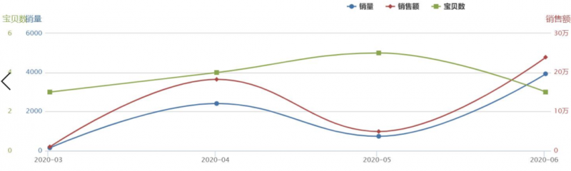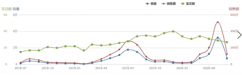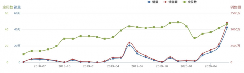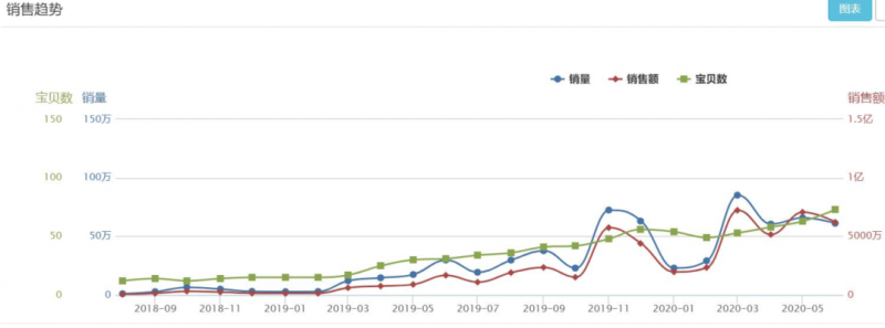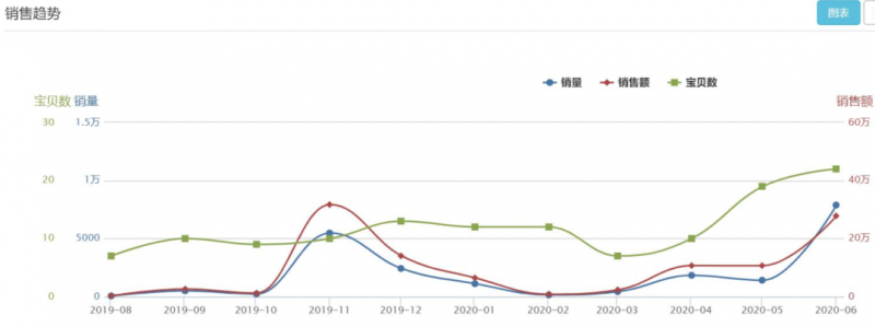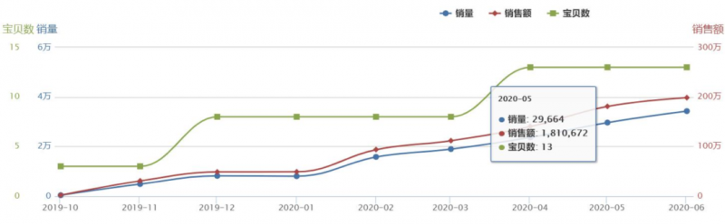 趋势同上大盘,从2020年3月开始有快速的增长,店铺数从个位数增至56家;宝贝数从几十个增至104个;