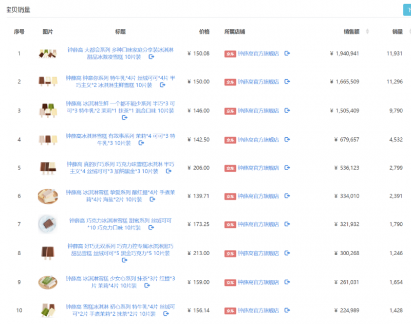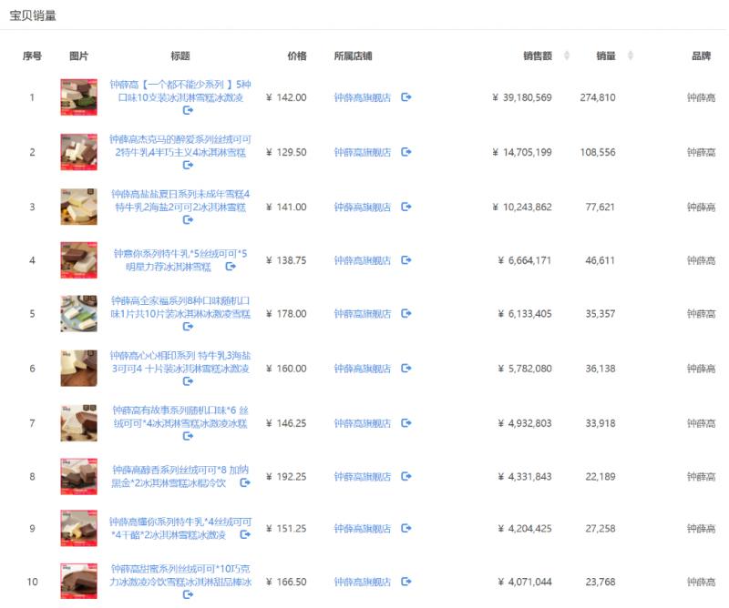 2020年1月至6月,淘宝+天猫渠道销售TOP10宝贝如下,均为钟薛高天猫旗舰店产品。