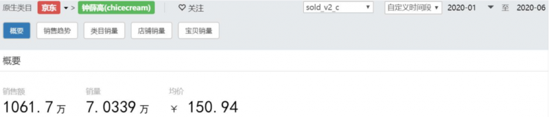 从销量、销售额、宝贝数、店铺数、均价这5个维度看,自钟薛高天猫旗舰店上线(2018年5月)至2020年6月的数据如下: