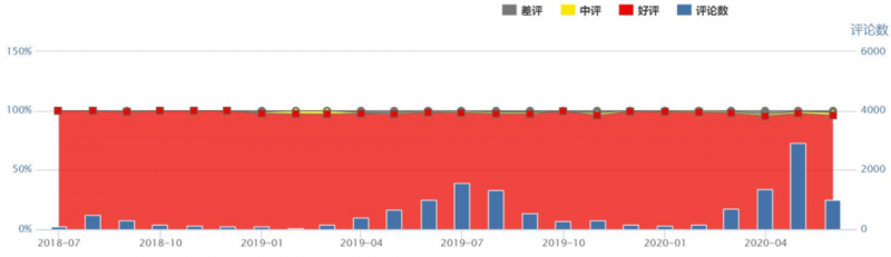 自旗舰店上线以来,2019年4月-9月、2020年3月-6月 每月新增评论较多, 其中2020年5月达到史上最高2992条。