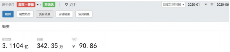 根据魔镜市场情报后台数据, 王饱饱在淘宝+天猫平台2020年1月至6月销售额合计3.11亿元(其中3月份更是创造了开店以来单月最高销售额7414.3万元),销量342.35万件,均价90.86元。其中,天猫店销售额3.1亿元,销量340.72万件,均价91元;淘宝店销售额95.1万元,销量1.63万件,均价58.48元。天猫店销售额占总销售额的99.6%,其销售额、销量、均价均高于淘宝店。