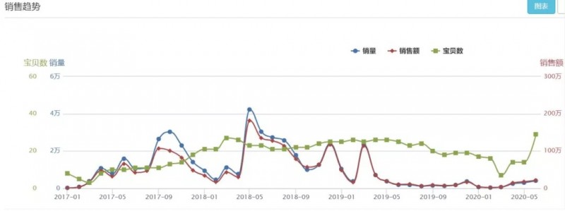 淘宝企业店(店名:王饱饱 )上线时间为2017年1月;从上线至2020年6月,整体销售趋势如下: