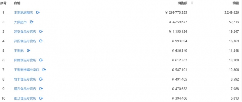 2020年1月至6月,淘宝+天猫渠道销售TOP10店铺均为天猫店,如下,其中王饱饱天猫旗舰店销售占整个销售的96.4%。