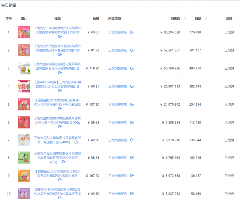 2020年1月至6月,淘宝+天猫渠道销售TOP10宝贝如下,均为王饱饱天猫旗舰店产品。