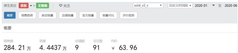 根据魔镜市场情报后台数据,2020年上半年,王饱饱在京东平台销售额合计284.21万元,销量4.44万单,均价63.,96元。京东平台销售额占品牌整个电商渠道销售总额的4%,销售额、销量远低于淘宝+天猫;京东渠道均价低于天猫渠道,但高于淘宝渠道。