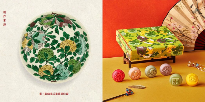 其中,“芳盒·丹若着锦”的礼盒设计灵感源自清康熙年间的文物“素三彩暗花云龙花果纹盘”。通过现代工艺手法,把文物中所描绘的饱满果实以及鲜艳的色泽重现在芳盒上,同时也将秋天花果丰硕、团圆美满表现得淋漓尽致。