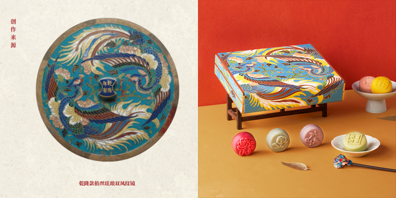 近日,奈雪的茶联手朕的心意·故宫食品推出了2款“芳盒”系列月饼。月饼设计从古董瓷器、掐丝珐琅、宋徽宗喜爱的字画等文物中获得灵感,将传统文化融入月饼之中。2款月饼礼盒“芳盒·丹若着锦”、“芳盒·凤凰翙羽”既像是穿越百年的中秋祝福,又像来自历史长河的悠然回响。