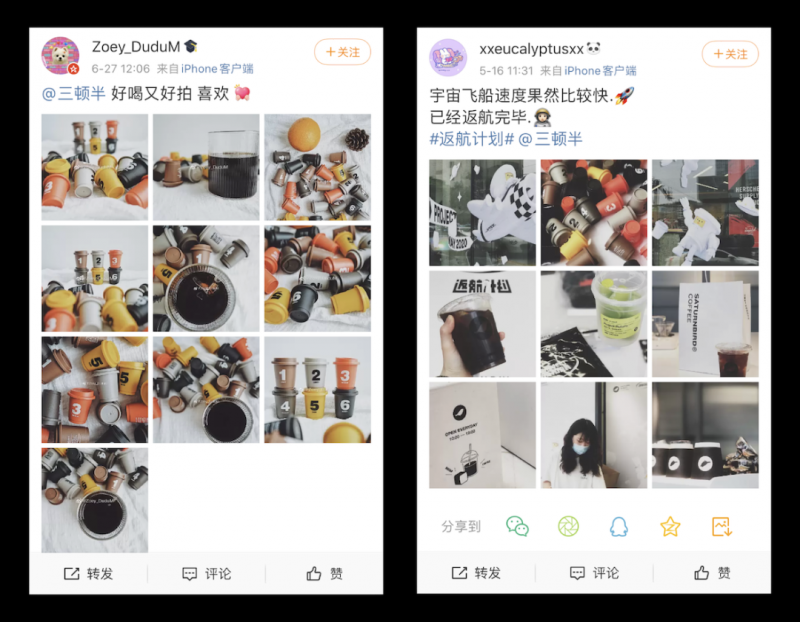 第一个是三顿半,经常被营销圈和 VC 圈用一个词来描述三顿半用户晒图的盛况——成图率。