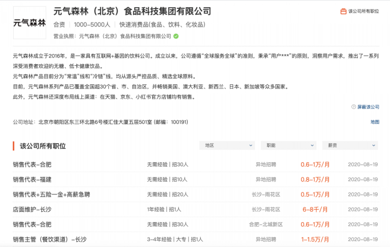 在某招聘网站上,打开元气森林的招聘主页,各区域城市的销售主管、销售人才是招聘重点,尤其是一些三四线城市,只对销售人员有需求。