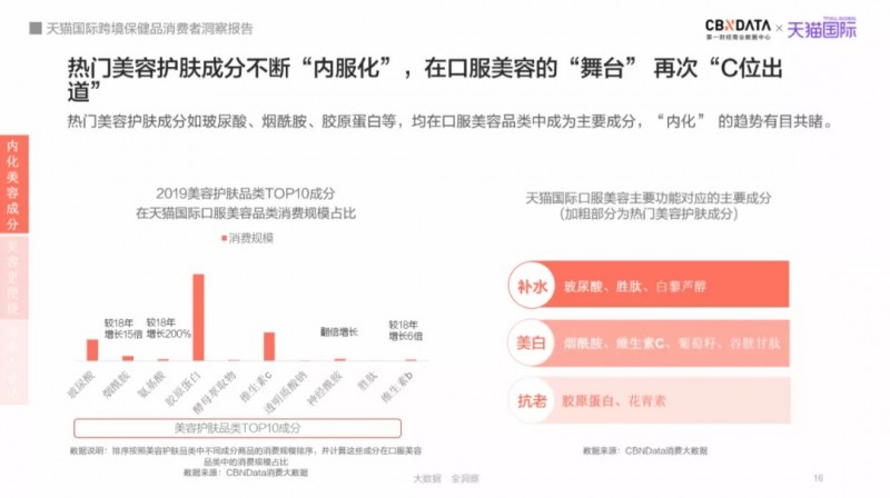 美颜类消费者热衷将美容护肤成分“内服化”。根据CBNData《报告》,近年来通过口服玻尿酸、烟酰胺、胶原蛋白等,实现补水、亮白、抗初老等作用的口服美容产品订单量均有显著提升。