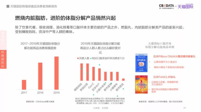 CBNData《报告》显示,新型体脂分解产品也逐渐占有一席之地,深受精致妈妈、资深中产的新宠喜爱。