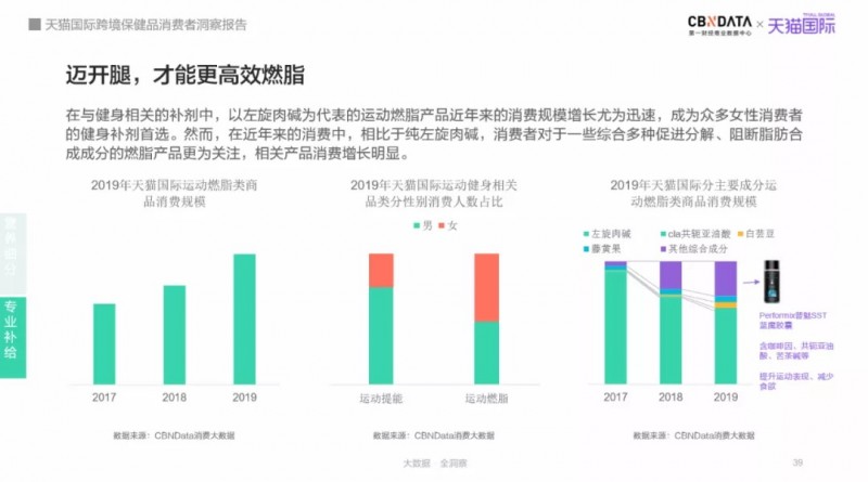 此外,女性消费者更加青睐以左旋肉碱为代表的运动燃脂产品。近年来,消费者对于一些综合多种促进分解、阻断脂肪合成成分的燃脂产品更为关注。关于如何科学健身更加有效,消费者也在不断进化。