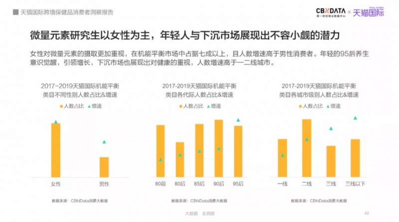 在当今消费者的心目中,“缺啥补啥”早已不是一个抽象的词。消费者对于如何平衡身体机能的研究,早已到了微量元素的层面。免疫力与心血管、消化和内分泌平衡都是研究的对象。根据CBNData《报告》,微量元素“研究生”以女性为主,年轻人与下沉市场潜力不容小觑。