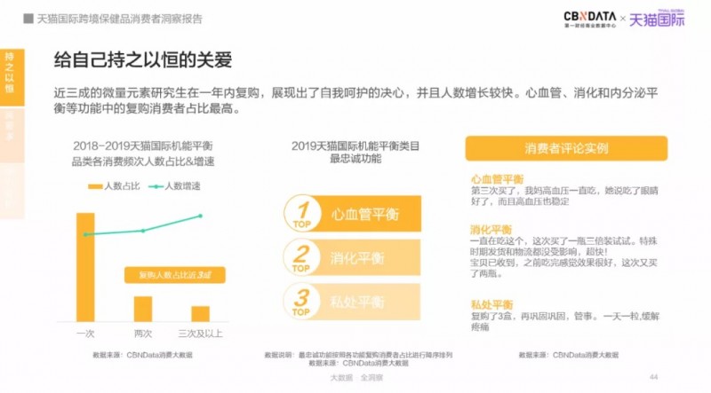 8月21日,第一财经商业数据中心(CBNData)联合天猫国际发布了《天猫国际跨境保健品消费者洞察报告》(以下简称《报告》,点击阅读原文查看完整内容),依托CBNData 消费大数据,分析线上跨境保健品市场的增长情况、洞察不同消费者人群及喜好特点,为相关领域的品牌营销提供参照。