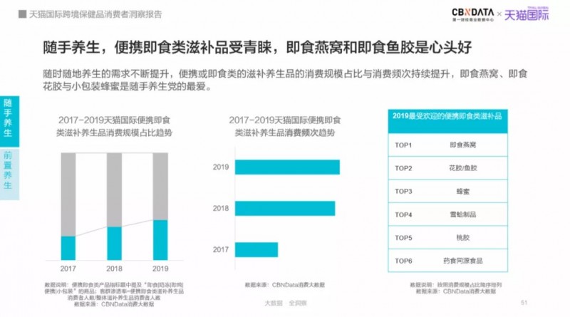 近年来,随着消费者健康意识的提升,滋补养生品类规模与人数高速增长。以新锐白领与新锐妈妈为主力的年轻一族更偏爱便携即食类的养生滋补品,这一消费潮流带动人身燕窝等传统高档滋补品也呈现出即食化的趋势,养生方式逐渐多样化。