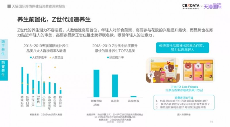 CBNData《报告》显示,Z世代养生人群人数增速高居首位,对即食燕窝、高丽参与花胶的兴趣提升最快。因此,许多贴合年轻人审美和喜好的传统滋补养生品类正在努力吸引年轻人的注意,如高丽参品牌正官庄推出跨界联名款,引发养生新风尚。