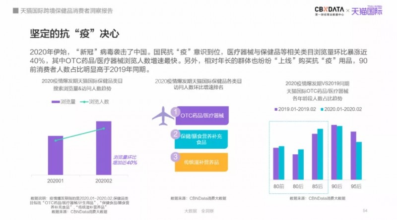 1)2020年中国跨境消费用户将超过2亿人,线上跨境消费逐渐成为日常,其中,天猫国际连续四年稳居第一,最受消费者信任,越来越多的消费者选择在天猫国际购买保健品。