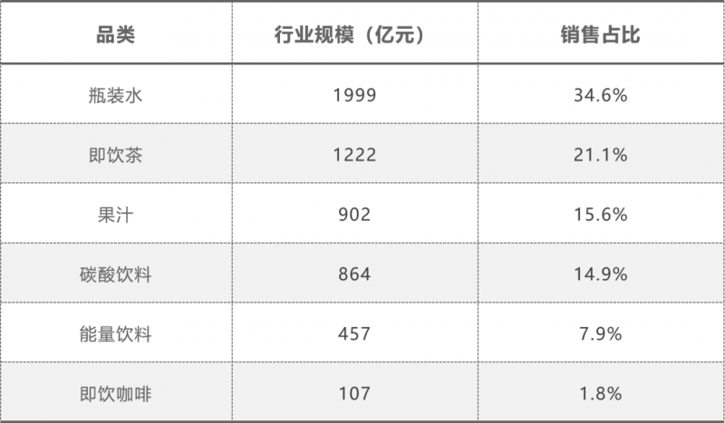 2019年,瓶装水/能量饮料的销售占比为34.6%/7.9%,分别较2009年提升13.5%和6.1%,且未来有望延续高增趋势。