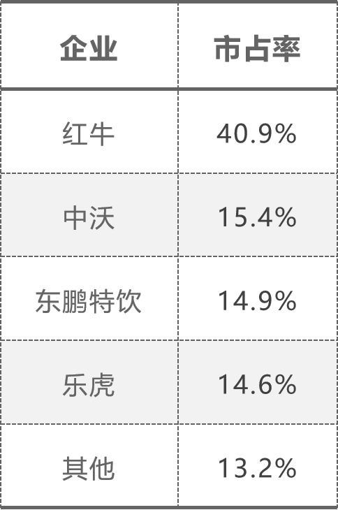 国内“一超三强”格局稳固。2013年之前红牛几乎一家独大,市占率在70%以上。但伴随乐虎、中沃入局能量饮料,红牛市场份额出现下降,直至2017年开始逐步企稳,2019年红牛市占率为40.9%,中沃、东鹏特饮、乐虎市占率分别为15.4%、14.9%、14.6%,行业形成“一超三强”格局,四者合计达到约86%的市占率。