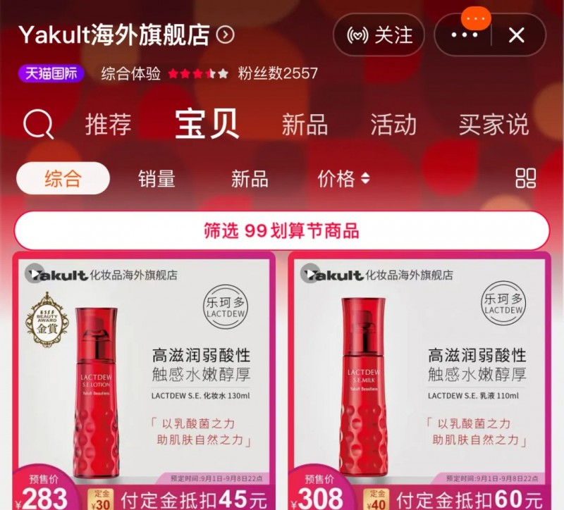 据了解,目前,“Yakult海外旗舰店”产品全部为养乐多日本本土化妆品,品牌有乐珂多、瑞维希、帕瑞奥、颐克堤等,产品涵盖水乳、精华等品类,产品涵盖水乳、精华、面霜、面膜、洁面乳等品类。价格区间为100-2000元不等。
