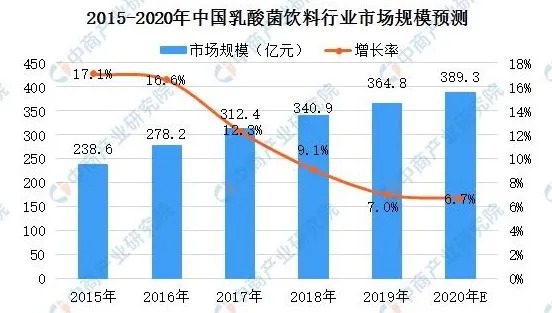 近年来,中国乳酸菌饮品市场保持了较为快速的发展,2015-2019年,乳酸菌饮品保持了11.2%的平均复合增长率,至2019年市场规模约为364.8亿元。未来乳酸菌饮品市场将保持持续稳定的发展,预计2020年有望达到389.3亿元的规模。