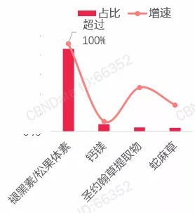 从图表中可以看出,在我国睡眠类产品中仍以褪黑素为主导,其次是钙镁、贯叶连翘(圣约翰草提取物)及蛇麻草(酵母花、啤酒花)。